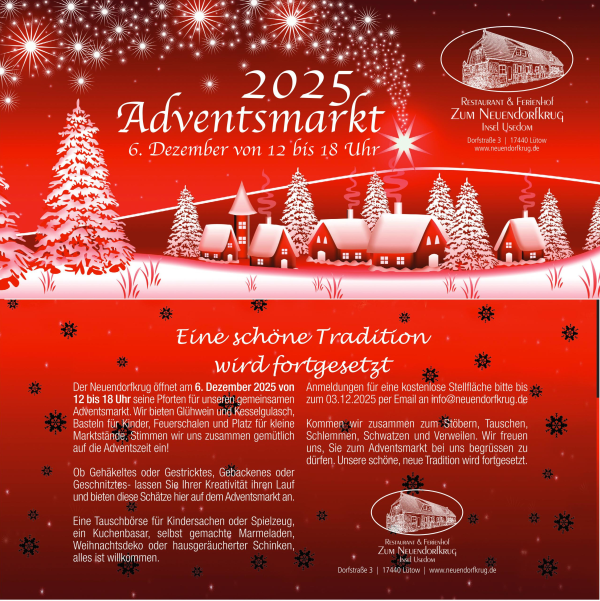 Unser Adventsmarkt findet am 06. Dezember von 12:00 Uhr - 18:00 Uhr statt.